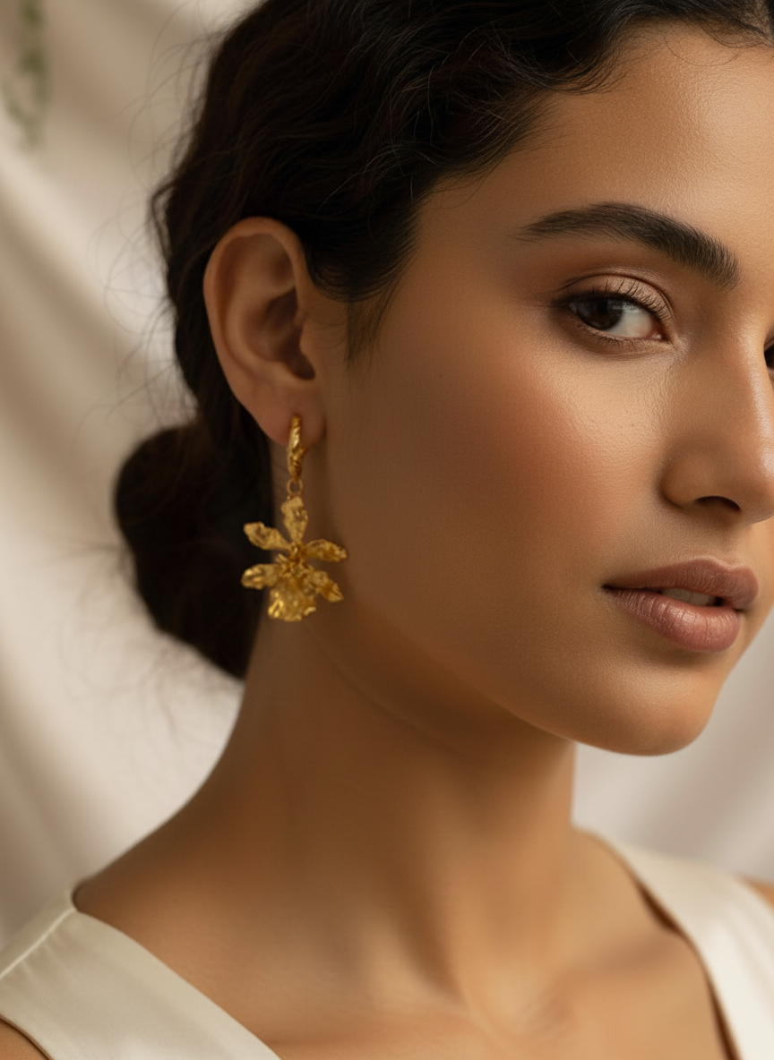 Los Aretes Topo Orquídea Chocolate celebran la exquisita belleza de la orquídea Oncidium Sharry Baby, conocida por su encantador aroma a chocolate. Recolectadas directamente de nuestro jardín, estas flores únicas se inmortalizan en bronce y se realzan con un baño en oro de 24k, creando una pieza de joyería verdaderamente única. Perfectos para cualquier amante de las orquídeas o para cuando quieres añadir un toque especial y natural a tu colección de accesorios.