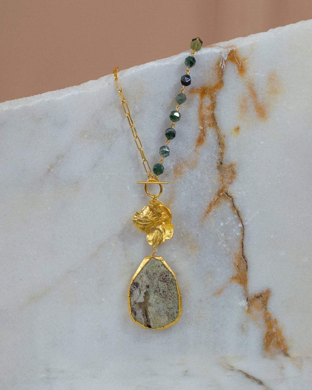 Collar en cuarzos con berilio y flor de hortensia natural inmortalizada en metal y bañadas en oro de 24 Kilates con protección en laca cataforética (evita daños por el tiempo y el ambiente). La imagen es de referencia y el producto final puede tener variaciones mas que todo en forma y tamaño, debido a que cada joya se realiza con una pieza original natural. No utilizamos moldes. #SomosNaturalezaViva.